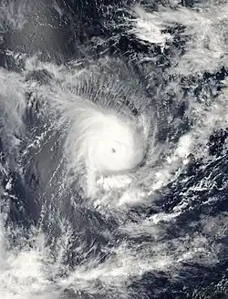 The third tropical cyclone and first intense tropical cyclone of the season, Hondo developed out of a tropical disturbance in early February about 1,020 km (630 mi) east-southeast of Diego Garcia.[88] The disturbance quickly strengthened, becoming a moderate tropical storm on February 4 and a severe tropical storm the following day.[89] After a brief period of slower intensification, Hondo rapidly intensified into an intense tropical cyclone and reached its peak intensity with winds of 215 km/h (134 mph) 10-minute winds) on February 7.[89] Around the same time that Météo-France assessed Hondo to have peaked, the JTWC reported that the storm had attained winds of 240 km/h (150 mph) 1-minute winds), equivalent to a strong Category 4 hurricane.[90]