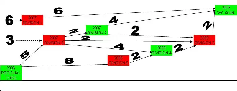 The above diagram shows the chronological order and structure of the divisions within the World Cricket League. From left to right the chronology of the divisions is indicated; from top to bottom the hierarchy within the competition. The arrows indicate the number of teams promoted and relegated between leagues
