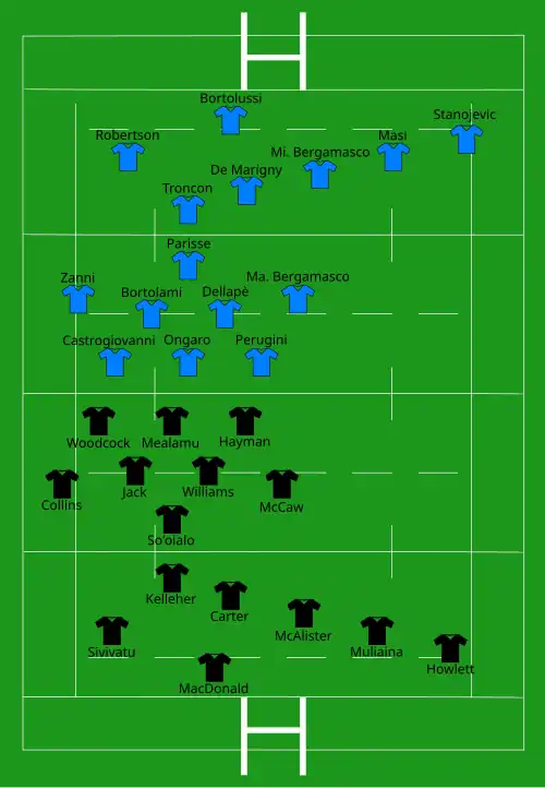 | Try: McCaw (2) 2' c, 7' c Howlett (3) 12' c, 56' c, 59' m Muliaina 15' c Sivivatu (2) 18' c, 29' m Jack 50' c Collins (2) 68' c, 70' c Con: Carter (7/9) McAlister (2/2) Pen: Carter (1/1) 11' | Report | Try: Stanojevic 38' c Mi. Bergamasco 71' c Con: Bortolussi (1/1) De Marigny (1/1) |