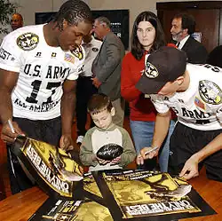 Sergio Kindle (left) and Chris Caflisch signing autographs for children from the Warm Springs Rehabilitation Center in San Antonio.