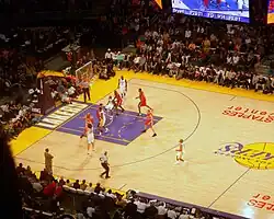 The 2008–09 Los Angeles Lakers season was the franchise's 61st season, 60th in the National Basketball Association (NBA) and 49th in Los Angeles. Coming off an appearance in the 2008 NBA Finals, the Lakers won their division for the 31st time and appeared in the NBA Finals for the 30th time.[1] With 65 wins, they tied the 1986–87 team for the third most wins in franchise history, the most since 1999–2000, and improved on their 2007–08 record by eight wins.[2] The Lakers sold out all 41 home games for the season, led the NBA in money earned from overall ticket sales, and had the 5th highest increase in gate receipts from the previous season.[3] The Lakers had the third best team offensive rating in the NBA.[4]