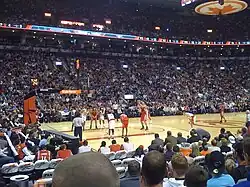 However, the Raptors could not keep up their new game plan of solid defence and lost four of their next five games, including a blowout loss to the Atlanta Hawks and another to the Boston Celtics after relinquishing a 17-point lead.[11] While Bosh posted impressive numbers in nearly every game, his teammates were not as consistent. Toronto's depth at the point was soon put to the test when Calderón was injured and unable to play against the rising Miami Heat. Solomon took over the reins with ease in that game and coupled with the Raptors' domination in the frontcourt led by O'Neal, Toronto secured a much needed win.[12] Moon was also dropped to the bench, with Bargnani made the starting small forward. This performance came to naught in the next game against the Orlando Magic, where although Bosh and O'Neal combined for 54 points and 28 boards, the lack of production and defence from the wing, coupled with the inability to protect possession, brought Toronto back to .500.[13] As though to prove a point, Bargnani and Anthony Parker combined for 44 points the next day in the win against Miami, while the tandem of Bosh and O'Neal secured 28 rebounds.[14] This run was not sustained yet again, as Toronto lost a further two games on the trot: an overtime loss to New Jersey and another blowout loss to Boston, where the Raptors set a franchise record for highest field goal percentage (62%) conceded at home.[15] That game also saw Bosh unleash a bout of angry frustration at his team as the Raptors plummeted to the bottom of the division standings.[15]