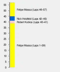 By lap 10, Massa had opened his lead over Räikkönen to 4.4 seconds, ahead of Kubica, Heidfeld, Kovalainen and Trulli.[26][29] Kubica was the first of the frontrunners to pit, on lap 17.[30] Räikkönen and Trulli followed on lap 20; Massa pitted from the lead one lap later.[30] Following the first round of pit stops, the gap between the Ferraris was 5.4 seconds, however by lap 31 Räikkönen had closed to within four seconds of his teammate.[26] Massa held a 3.6 second lead over Räikkönen when the two Ferraris pitted for the final time on laps 39 and 38, respectively, and Massa retained his lead into the final stint.[26][30] Kubica pitted on lap 41, Heidfeld on lap 45, and Kovalainen on lap 47.[30]
