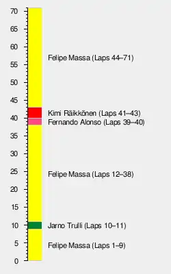 Nakajima spun on lap 13, losing five seconds on the lap.[26] On lap 15, Massa set a new fastest lap of 1:16.888, and extended his lead over Vettel.[26] Hamilton remained behind Fisichella, and though his McLaren car appeared quicker, he was unable to pass the Force India driver until lap 18.[26] Glock passed Fisichella two laps later. Trulli and Bourdais collided on lap 20 into turn one, sending the Toro Rosso driver across the grass. Bourdais lost six places and rejoined in 13th place.[29][36] Trulli's Toyota teammate, Timo Glock, passed Fisichella later on in the same lap for sixth. Massa and Sebastian Vettel traded fastest lap times; Vettel's 1:14.214 on lap 25 was surpassed by Massa's 1:14.161 a lap later.[29][37] However, Vettel made a pit stop soon after, having been lighter-fuelled than his Ferrari opponent.[35] He rejoined in sixth position, behind Glock.[33] Kovalainen passed Trulli and Fisichella in separate manoeuvres, gaining seventh position.[26] On lap 36 Massa set the fastest lap of the race, a 1:13.736.[37]