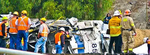 ![]() Rescue workers in front of the Metrolink locomotive lying on its side after penetrating the lead passenger car (left) | |||||||||||||||||||||||||||||||||||||||||||||||||||||||||||||||||||||||||||||||||||||||||||||||||||||||||||||||||||||||||||||||||||||||||||||||||||||||||||||||||||||||||||||||||||||||||||||||||||||||||||||||||||||