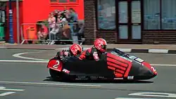 The 3 lap (113.00 miles) Sidecar TT Race 'A' was run in the same warm weather conditions as the Superbike TT Race. It was the 600c LCR Honda outfit of Nick Crowe/ Mark Cox that had dominated practice with a fastest time of 19 minutes, 35.66 seconds an average speed of 115.534 set on Friday evening practice. The first competitor away from the TT Grandstand was the 600cc DMR Suzuki sidecar outfit of Dave Molyneux/Dan Sayle that immediately retired at the end of the pit-lane with clutch problems.[14] The 600cc LCR Suzuki of John Holden/Andrew Winkle led the Sidecar TT Race 'A' at Glen Helen by 1.86 seconds on lap 1 from the LCR outfit of Nick Crowe/ Mark Cox with the 600cc LCR Honda of Klaus Klaffenbock/Christian Parzer in third place a further 3.36 seconds behind the leaders. At Ballaugh Bridge on the first lap, John Holden/Andrew Winkle had extended their lead to 3.5 seconds and to 6 seconds by Ramsey Hairpin over Nick Crowe/Mark Cox. The 600cc LCR Honda sidecar of Klaus Klaffenbock/Christian Parzer retired just before Parliament Square in Ramsey and the 600cc Yamaha of Steve Norbury/Rick Long now moved into 3rd place and the 600cc Suzuki of Simon Neary/Jamie Winn into 4th place. As Nick Crowe/Mark Cox increased their race pace, the lead of John Holden/Andrew Winkle fell from 5.3 seconds at the Bungalow to 3.1 seconds at the end of lap 1 at the TT Grandstand.[14]