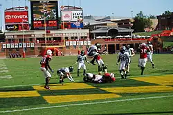 In December 2007, Maryland hired Kansas State offensive coordinator James Franklin to serve in that same role for the Terrapins.[4] From 2000 to 2004, he was the Maryland wide receivers coach. In 2003 and 2004, he also served as the recruiting coordinator, and Rivals.com ranked Franklin as one of the nation's top-25 recruiters both years.[5] Because of the arrival of Franklin, 2008 was the first since 2005 that head coach Ralph Friedgen did not call the offensive plays himself.[4] At Maryland, Franklin installed a West Coast offense, which was well suited to quarterback Chris Turner's playing style and an experienced wide receiver corps that included play-maker Darrius Heyward-Bey and sure-handed Danny Oquendo.[6]