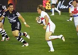 In the 47th minute, New Zealand were on the attack and were the first to score in the second half when a long pass from Hohaia out to Vatuvei saw him dive over untouched in the left corner for his second try of the match. The video referee awarded the try and Luke's sideline conversion attempt was wide, so the score was New Zealand 18, England 24. The Kiwi's then continued dominating possession and field position and in the 55th minute Vatuvei scored his 3rd, again diving over untouched in the corner after receiving a long ball from Hohaia. Once more Luke had to kick for goal from the sideline and this time was successful so the scores were level at 24 all. In the 69th minute, Luke gained his team a penalty when he was given a push by an England player while running in to contest a bomb and fell to the ground.[21] The Kiwis decided to take the kick from in front of the posts and Luke got the two points which put New Zealand in the lead for the first time at 26–24. New Zealand were attacking England's line again in the 75th minute when an English defender fumbled an intercept chance and from the confusion Nathan Fein, who was playing on despite a broken nose, picked up the ball and crashed over. The try was awarded by the video referee and the conversion was kicked by Jeremy Smith, so New Zealand led 32 to 24 with 5 minutes of the match remaining. The Kiwis got one more try, again from Lance Hohaia throwing a long ball out to Manu Vatuvei to cross untouched on the left wing once more, his fourth try for the night. Benji Marshall took the sideline conversion attempt and missed, but the game was already beyond doubt, with New Zealand winning 36–24.[22]