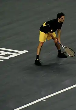 Jo-Wilfried Tsonga, ranked 38 on January 1, defeated Murray, Gasquet and Nadal en route to his first final in the ATP Tour at the Australian Open (lost to Djokovic).[34] Sidelined during three months of the season due to a right knee injury, Tsonga missed both the French Open and Wimbledon,[35] coming back to competition at the US Open where he was defeated in the third round (lost to Robredo).[36] Tsonga won his first career title in a rematch of the Australian Open final in the International Series event of Bangkok (def. Djokovic), and earned his Tennis Masters Cup qualification with his second career title (his first Masters Series shield) at the Paris Masters (def. Nalbandian).