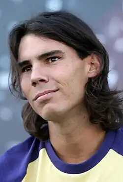 Rafael Nadal, who reached his first hard courts Grand Slam semifinal at the Australian Open (lost to Tsonga),[3] qualified after winning the French Open for a fourth consecutive time, matching Björn Borg's record performance from 1978 to 1981.[4] He broke Roger Federer's streak of five consecutive titles in Wimbledon as he defeated the Swiss 6–4, 6–4, 6–7, 6–7, 9–7, in a four-hour-forty-eight-minute-long final – the second longest championship match in Wimbledon's history – to become the first tennis player to complete the Roland-Garros/Wimbledon double since Borg.[5] In addition to the two Grand Slam titles, Nadal had also, at the time of his qualification, reached two finals in Chennai (lost to Youhzny) and Miami (lost to Davydenko), won his fourth consecutive title in Monte Carlo (def. Federer) and at Barcelona (def. Ferrer), and his first in Hamburg (def. Federer) and at London's Queen's Club (def. Djokovic), where he became, two weeks before his Wimbledon victory, the first Spaniard to win a grass court title since Andrés Gimeno in 1972.[6] After his qualification, Nadal clinched a second title at the Canada Masters (def. Kiefer), a gold medal at the 2008 Beijing Summer Olympics (def. González), and a semifinal run at the US Open (lost to Murray). On August 18, after 160 weeks at ATP No. 2, Rafael Nadal overtook Roger Federer, breaking his 237-week streak at the top spot, to become the 24th player to hold the No. 1 rank in the twenty-five years of computerised-rankings history.[7] Nadal eventually withdrew in the run-up to the tournament, citing fatigue.[8]