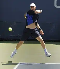 Day 2 saw the first round matches from the bottom half of the draw begin; Fernando González, Fernando Verdasco, Ivo Karlović, Tommy Robredo, Igor Andreev, and Paul-Henri Mathieu all progressed.[14] Defending champion and number two seed Roger Federer, playing his first Grand Slam since the 2004 Australian Open at a seeding lower than number one, beat Máximo González 6–3, 6–0, 6–3,[15] and Andreas Seppi, the thirty-first seed, triumphed in five sets (6–3, 7–5, 3–6, 3–6, 6–3) over Hyung-taik Lee. Four seeds exited the tournament: Richard Gasquet, who lost in five sets to former world number two Tommy Haas; Tomáš Berdych, who lost to home favorite Sam Querrey in a humbling 6–3, 6–1, 6–2 scoreline;[16] Canada Masters runner-up Nicolas Kiefer, who retired at two sets to one and 4–1 down in his match against Ivo Minář; and Mikhail Youzhny, who withdrew due to a viral illness.[14][17][18]