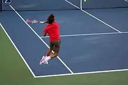 In the one men's semifinal that was completed, Federer, who had endured a poor season by his standards,[71] defeated Djokovic 6–3, 5–7, 7–5, 6–2 to reach his third Grand Slam final of the year, and seventeenth overall. The last time the pair had met on hardcourts was in January, in the Australian Open semifinal,[86] where Djokovic had convincingly beaten Federer;[87] the time before this was in the aforementioned 2007 final, where Federer had won in straight sets. Both players made impressive starts to their encounter on this occasion, as they secured easy holds of serve the opening two games. However, in third game, Federer broke, and did not lose another service game in the first set. In the second set, it was Djokovic who gained the early break, and he led 3–1 before Federer rallied back to draw level at 4–4. However, this proved to be in vain as Federer, who had already saved two set points from 0–40 down,[71] was broken at 5–6 to hand Djokovic the second set. The score was deadlocked at 5–5 in the third when Federer fashioned a crucial break of serve, and went on to win the set. During the match, Djokovic had felt the wrath of the US crowd, who were vociferous in their support for Federer, and who at times cheered when he hit unforced errors. After being broken at 5–5, Djokovic turned and gave them a mock gesture of thanks, which only incited them further.[71] Federer added afterwards that he felt he had broken Djokovic's will by winning this set. Federer broke again in the fifth game of the fourth set, and did not lose another game as he cruised to victory.[88] The other men's semifinal, between Nadal and Murray, was suspended with the score at 6–2, 7–6(5), 2–3 in Murray's favor (although he was a break down in the third). Murray began the match in an aggressive manner, serving and volleying, and hitting several winners from the back of the court. He was rewarded with two breaks of serve in the first set, at 1–1 and 4–2. Murray continued to bother Nadal on serve in the second, but could not break, despite holding seven break points, and facing none against himself. In the tie-break, he squandered an early lead before reeling off three points in a row at 4–5 down to gain a two-set advantage. Nadal broke Murray early in the second set, before a short postponement in play was initiated when a light rain appeared, in order to give the referee time to assess whether the court was still suitable for play. Murray queried the initial decision to stop play, but the rain soon came on stronger, and the match was suspended overnight.[89]