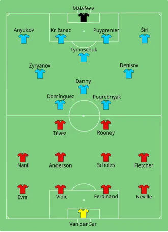 Zenit won the match 2–1, Pavel Pogrebnyak scoring just before half-time, before Danny doubled the Russians' lead just before the hour mark. Nemanja Vidić reduced the deficit to one goal in the 73rd minute, but it was not enough to wrest the trophy from Zenit's grasp, as they became the first Russian team to win the competition. The sending-off of Paul Scholes for handball in the 90th minute resulted in him missing Manchester United's opening game in their defence of the Champions League, a home tie against Villarreal.[5]