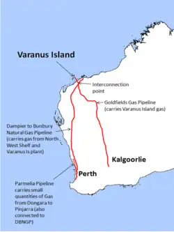 Since 1996, Varanus Island, 70 kilometres (43 mi) from the Western Australian coast, has operated as a hub for oil, condensate and gas gathering infrastructure belonging to several petroleum joint ventures, including Harriet JV and John Brookes JV. The island's facilities include large tanks where condensate is stored prior to being offloaded onto tankers, and five gas plants. Condensate, water and other impurities are removed from the gas arriving from the offshore platforms connected to the island. Most of the carbon dioxide is removed so the gas can meet the specifications of the onshore pipelines and end users.[1] Gas from the plant is sent via two subsea pipelines to the mainland, where the pipelines connect to the Goldfields Gas Pipeline and the Dampier to Bunbury Natural Gas Pipeline.[2] Before the incident, the plant produced 365 terajoules of gas per day for the state market.[3]