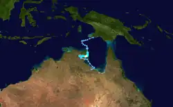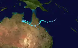 On 23 March TCWC Darwin reported that a tropical low had formed in the Arafura Sea. On 27 March, Darwin reported that it had strengthened into Tropical Cyclone Paul and was moving southward parallel to the coast in north-east Arnhem Land in the Northern Territory.[29] On 28 March the system had stalled and was nearly stationary in the vicinity of Cape Shield.[30] By 29 March the tropical cyclone had strengthened to a Category 2 cyclone.[31] Later that evening the tropical system made landfall just south of Cape Shield. Over land the tropical system weakened and by afternoon on 30 March was downgraded to a tropical low.[32] Late on 31 March, after meandering over Arnhem Land the tropical system re-entered the Gulf of Carpentaria.[33]