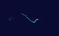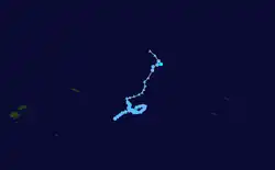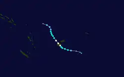 Tropical Depression 10F formed on February 9 near 13S 172W, in the vicinity of Samoa. Late on February 11, RSMC Nadi upgraded the storm to a category 1 cyclone and named it Rene.[13] It continued to strengthen as it moved south of American Samoa, and reached Category 4 on February 14. In American Samoa roads were damaged by landslides caused by the cyclone's heavy rain, and substantial damage was caused to crops.[14] It had weakened to category 3 when it passed through the Vava'u island group of Tonga, and on February 15 the eye was reported to have passed over the Tongan capital Nuku'alofa.[15] The main island of Tongatapu was left without power and water.[16]