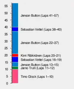 At the start of lap 2, Button overtook Hamilton to claim third position.[12] The KERS-aided McLaren of Hamilton then kept Vettel's Red Bull at bay, and only when Hamilton entered the pits on lap 15 did Vettel finally pass him.