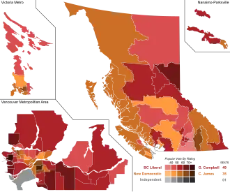 | Liberal | Gordon Campbell | 85 | 751,661 | 55,457 |