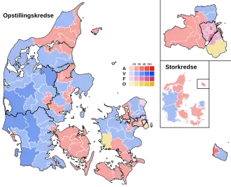 ![]() Largest party within each Folketing nomination district and constituency. | ||