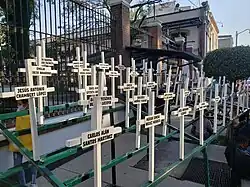 Neighbors conducted a candlelight vigil the morning of June 7 at the University of Sonora in Hermosillo.[46] Stories of the victims appeared in news stories. Camila, a three-year-old girl perished in the fire from asphyxiation.[14] María, Julio, Fátima, Carlos, Sofía and Dafne were among the 41 pre-schoolers who were mourned at several funeral ceremonies that took place on the Saturday following the blaze.[47] The parents of two-year-old María Magdalena Millán, among those buried Saturday, attached a Dora the Explorer balloon to the cross marking her grave, while her mother cried out, "I love you and I don't want to leave you here!"[11] Germán León battled his injuries, but died Saturday morning, just days after his fourth birthday.[11] The family of 2-year-old Daniel Alberto Goyzueta Cabanillas, who died of smoke inhalation, held a funeral late Saturday afternoon for the boy.[48] The family of 2-year-old Camila Fuentes Cervera also held her funeral Saturday.[22]