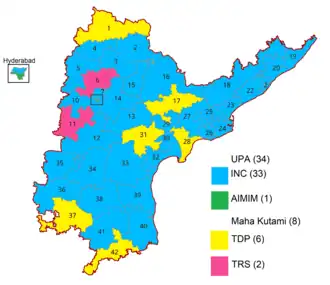 The results were a repeat of the last election, where the Indian National Congress and the UPA, won 34 out of 42 seats, resulting in a landslide victory. The popularity of Chief Minister Rajasekhar Reddy earned him a landslide victory in the national election and winning his re-election, in the state election.