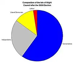 The result of the election was 'no change', with the Conservatives retaining an overall majority by winning twenty-four of the forty seats available. Of the sixteen remaining seats, ten went to independents, five to the Liberal Democrats and just one to the Labour Party.[2] Although the Conservatives managed to retain control, the Isle of Wight was still the only council in England in which they lost seats.[3] Among the factors which could have led to this relatively poor performance are the recent education reforms on the Isle of Wight, which led to protests over the closure of island primary schools. The "Standards not Tiers" independent candidate Chris Welsford beat the sitting Conservative councillor Jonny Fitzgerald-Bond by 141 votes in the Ventnor East ward. In the Cowes West and Gurnard ward, which was at the heart of education reforms, sitting Tory councillor Alan Wells was beaten by independent candidate Paul Fuller.[2] The large numbers of independent candidates standing at this election and the increased level of support for them could also be attributed to the ongoing United Kingdom Parliamentary expenses scandal, pushing voters away from the mainstream political parties represented in the House of Commons.