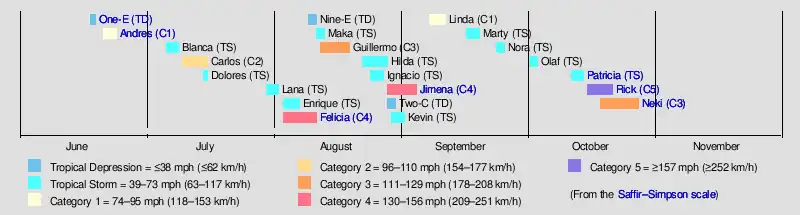 For the first time since 1999, the first system of the season did not form until mid-June. [1] Three days after One-E formed, the first named storm of the season, Hurricane Andres developed. Activity picked-up during peak-season, and according to the NHC's tropical weather summary, August 2009, with seven named storms in their region, was one of the most active Augusts on record for the basin. This level of activity had rarely occurred, if at all, in the past 41 years, since 1968, when the most active August on record for the region with eight named storms occurred.[2] When Hurricane Rick reached Category 5 strength on October 17, it became the first Category 5 Pacific hurricane since Ioke in 2006, and the third-strongest Pacific hurricane on record, behind 2015's Patricia and 1997's Linda. The first Central Pacific name to be used was Lana, when it crossed into the region from the Eastern Pacific. With the naming of Tropical Storm Maka on August 11, this season became the first in seven years to use multiple Central Pacific names.