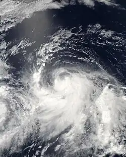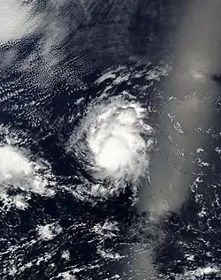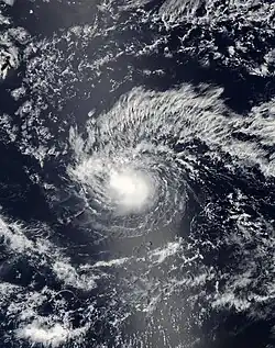 A tropical wave departed the west coast of Africa on June 25, which moved across the Atlantic without development. The wave entered the eastern Pacific on July 4, later developing more convection on July 8 to the south of Mexico. Early on July 10, convective banding features developed along the periphery of the system[36] and an area of low pressure developed within the wave.[37] On July 10, the NHC designated the system as Tropical Depression Four-E about 900 mi (1,400 km) south of the southern tip of the Baja California Peninsula. Soon after, it strengthened into Tropical Storm Carlos while moving westward through an area of warm waters and light wind shear. On July 11, Carlos intensified further into a minimal hurricane. At that time, the small storm developed a small eye-like feature, which had disappeared the next day, causing Carlos to weaken back into a tropical storm. The eye feature redeveloped, signaling that Carlos reintensified into a hurricane on July 14, reaching peak winds of 105 mph (169 km/h) early the next day. Located at 10.1ºN, this made Carlos the southernmost Category 2 hurricane in the eastern Pacific proper. Late on July 15, the hurricane encountered strong wind shear, resulting in rapid weakening. About 24 hours after its peak intensity, Carlos deteriorated into a tropical depression, and dissipated early on July 17 well to the southeast of Hawaii.[36]
