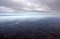 The Red River flows from the United States into Lake Winnipeg in Manitoba, Canada. Since it flows northward, into colder climates, melting snow and river ice, as well as runoff from its tributaries, often create ice jams, which cause the river to overflow. The valley is essentially flat, leading to overland flooding, with no high ground on which to take refuge.[5]