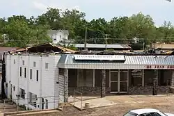 As the MCV crossed the Mississippi River and entered into more populated areas, it strengthened greatly, while it nearly separated from the initial line.[1][2] Numerous buildings were severely damaged or destroyed throughout southern Illinois. Immediately after the MCV struck, Carbondale was reported to be virtually impassable due to the amount of debris on roadways. Marion, Murphysboro, Grand Tower, Johnston City, Herrin, Energy, and Carterville, Illinois, declared curfews and states of emergency due to power outages and the massive amounts of damage caused by the storms. Some of these cities were even left without water due to the power outages.[1][51][52] In the city of Carbondale, damage was estimated at US$3,000,000, excluding damage at Southern Illinois University. Officials deemed 34 buildings a "total loss" and reported that 3,000 trees were felled throughout the city.[53]