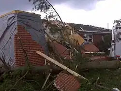 The initial squall line formed in central Kansas, to the northwest of Hutchinson.[15] In Hutchinson, several airplanes were flipped at a local airport, and 21,000 people were left without power. A woman was killed in New Albany, Kansas, when her mobile home was blown forty feet off of its foundation.[7] National Weather Service survey teams found that winds reached 120 mph (190 km/h) in the area, which also resulted in the destruction of a church and the town's post office, in addition to damaging several homes.[7][15] A total of 130 buildings were damaged in Cherokee, Kansas, including a high school gymnasium. Schools in several counties closed for the day, and a twenty-mile stretch of the Kansas Turnpike was closed for an hour due to flooding.[7]