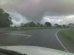 The tornado outbreak and derecho of May 8, 2009, colloquially known as the 2009 Super Derecho, was an extreme progressive derecho, tornado outbreak, and mesoscale convective vortex (MCV) event that struck southeastern Kansas, southern Missouri, and southwestern Illinois on May 8, 2009.[9][10] Thirty-nine tornadoes, including two of EF3 strength on the Enhanced Fujita Scale, were reported in addition to high non-tornadic winds associated with the derecho and MCV.[10] Due to the abnormal shape of the storm on radar and the extremely strong winds, many called this an "inland hurricane."[11][12] Notably, this storm had a defined eye akin to a tropical storm, which occurred alongside intense sustained winds of 70–90 mph (110–140 km/h) at the surface level, not associated with the bowing convection typical of a derecho.[13] A new proper class of storm, the "Super Derecho," has been used to describe this event after analysis in 2010.[14] Embedded supercells produced hail up to baseball size in southern Missouri, a rare event in a derecho.[2] A wind gust of 106 mph (171 km/h) was recorded by a backup anemometer at the Southern Illinois Airport after official National Weather Service equipment failed.[1] This derecho was the last of a series of derechos that occurred at the beginning of May.
