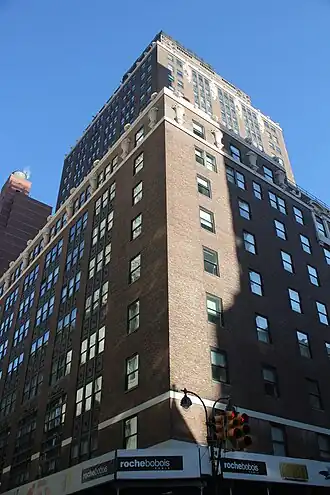 There is a setback on the eastern elevation above the ninth story, measuring 45 ft (14 m) deep. Behind this setback, the building tapers into a narrower tower.[9][10] This is because the eastern portion of the site was formerly zoned to allow only residential use, while the western portion could also accommodate commercial use. The offices were above the ninth story which occupied only the western part of the site.[11] The lowest nine stories (which occupied the whole site) were originally an apartment hotel.[11][12] The northern and southern elevations contain a setback above the eleventh or twelfth story.[13][14] The restriction on the Madison Avenue portion of the site expired in 1940.[15][16]