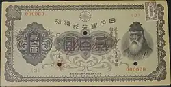 Notes of the second series were announced by the Ministry of Finance in 1927, and were printed that year in two different varieties. These all feature legendary Japanese hero-statesman Takenouchi no Sukune on the obverse. Their "Uraaka" nickname though, was coined by the public due to a red pattern featured on the reverse.[7] The first variety has a black on green underprint on the obverse side. These were marked with the printed word "SPECIMEN" in red script on the reverse. Second variety notes can be differentiated by a pale blue underprint on the obverse which features a different color and shape of the central guilloche.[9][10] There is no mention of the word "SPECIMEN" on the reverse side which has a slightly different red back pattern.[7] A majority of the second series banknotes were held back in vaults until the end of World War II.[11] There is a message on the obverse side of both varieties that mentions "Bond convertible". By the time the second series was finally issued on August 16, 1945 this message had become obsolete as the system of converting banknotes into gold coins had been suspended in 1942.[1][12]