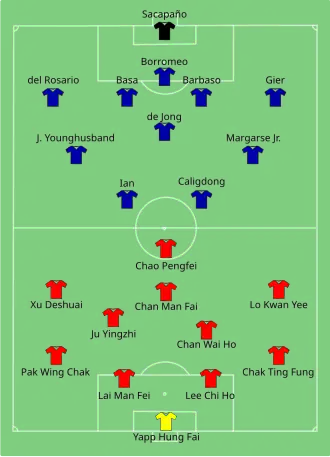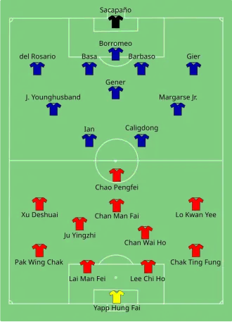 The first match of Hong Kong team was against the Philippines on 8 October. However, the heavy rain flooded the field, so the ball flow on the water and could not be kick. The match was abandoned at 14th-minute.[3] The rematch played on 9 October, Hong Kong defeated the Philippines by 4–2.[4]