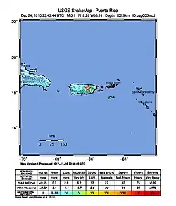 The 2010 Aguas Buenas earthquake, also referred to as the 2010 Christmas Eve earthquake (Spanish: Temblor de Nochebuena de 2010), occurred on December 24 at 7:43 p.m. local time in Aguas Buenas, Puerto Rico.[1] It measured 5.1 on the moment magnitude scale and had a maximum Mercalli intensity of VI (Strong). The event was the largest in Puerto Rico since May 16th of the same year,[2] and the largest to impact the San Juan metropolitan area since 1975.[3] The earthquake was felt throughout the island of Puerto Rico, the island municipalities of Vieques and Culebra, the American and British Virgin Islands, and even in the Dominican Republic across the Mona Passage.