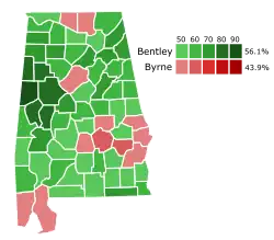 The 2010 Alabama gubernatorial election took place on November 2, 2010. Incumbent Governor Bob Riley was term-limited and unable to seek re-election. The party primaries were held on June 1, 2010,[1] with a Republican runoff on July 13. In the general election, Robert J. Bentley defeated Democrat Ron Sparks. This was the first election in which Republicans won three consecutive gubernatorial elections in the state. This was also the first time since Reconstruction that a Republican carried Colbert County, Franklin County, and Lawrence County in a gubernatorial race.