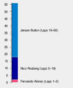 Several drivers, including Alonso, made pit stops for the intermediate compound tyres at the end of the second lap due to the intensifying rain.[39] Rosberg, Button and the Renaults of Kubica and Petrov chose to remain on the circuit and the former led the field back to racing speed when the safety car was withdrawn at the end of lap three. On the lap after, Kovalainen in seventh was passed by the eighth-placed Barrichello driving towards turn six. As Rosberg continued to pull away from Button on lap five, the stewards informed the Ferrari team that Alonso had jumped the start, for which he incurred a drive-through penalty.[36] He took the penalty on the next lap and rejoined the race in 14th.[35] Although the intermediate tyres initially provided an increase in speed, the rain did not intensify and every driver running on them made a second pit stop, providing Rosberg, Button, Kubica and Petrov with a significant lead over the rest of the field.[36] During this period, Hamilton got wheelspin and slewed sideways as he exited his pit stall alongside Vettel. The two made contact as the latter turned right and Hamilton veered close to the Williams mechanics before going behind Vettel.[40] Webber damaged the front wing after he hit the front jack. The incident cost him nine seconds and dropped him to tenth.[41] On lap nine, Hamilton passed Barrichello for 12th at turn one.[36] De La Rosa in fourth pulled off the side of the track on the same lap to retire with an engine failure.[39]