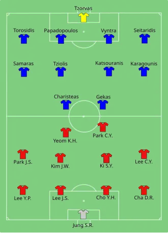 In the seventh minute, Ki Sung-yong's free kick near the left corner was inadvertently flicked on by Kostas Katsouranis, before Lee Jung-soo rushed to the back post to open the scoring.[2] The Koreans' lead was doubled through captain Park Ji-sung, who tackled Loukas Vyntra and sprinted all the way to fire a low shot into the corner of the net[2] as they kept their 2–0 win until the final whistle.