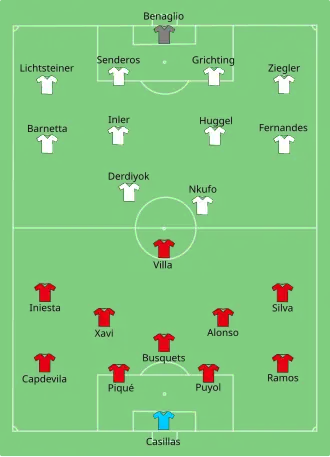 - ^ a b "Tactical Line-up – Group H – Spain-Switzerland" (PDF). FIFA.com. Fédération Internationale de Football Association. 16 June 2010. Archived from the original (PDF) on 22 July 2011. Retrieved 16 June 2010.