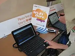 There was a focus on social networking at this jamboree which was entirely new. Generally, Scouts are instructed to leave their electronics at home when on camping trips, but this event was an exception. AT&T, one of the corporate sponsors, provided excellent cell phone coverage and a Wi-Fi network which spanned the entire site. This effected "a better signal in [the jamboree site] than in most residential areas."[6] AT&T also provided netbooks and cell phones for use by the Scouts in their Connection Centers, located throughout the site. There were also secure device charging lockers next to each connection center where phones or other devices could be recharged, although this set-up became controversial after Scouts began keeping the keys to the lockers in order to have a personal charging station. The jamboree trading posts sponsored competitions for videos and pictures submitted by participants. Staff members and signs placed around the site encouraged Scouts to tell about their experiences on various social websites. This allowed parents, siblings, and friends at home to get in on the action and see what was happening. Overall, the event was covered extensively on the internet as well as in local and national news.
