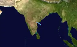 In early December, a low-pressure area formed over the Bay of Bengal. The low-pressure area moved towards the Indian coast and became more well marked. On December 7, the India Meteorological Department (IMD) upgraded the area of low pressure to a depression giving it the designation "BOB 06". At that time it was located approximately 450 kilometres (280 mi) south-southwest of Visakhapatnam, Andhra Pradesh, India.[73] Until December 8, the depression moved northwestwards and made landfall at Bapatla, Andhra Pradesh, India where it dissipated into a remnant low soon after the landfall.[74][75]