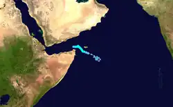 On May 19, the JTWC reported that Tropical Storm 02A had formed.[8] Later that day, the IMD upgraded the system into a depression and designated it "ARB 01". The IMD further upgraded the depression into a deep depression that same evening. Late, May 20, the IMD downgraded ARB 01 to a depression over the coast of Somalia. However, the next day it strengthened again to become Cyclonic Storm Bandu. The storm then weakened and dissipated on May 23.[9]