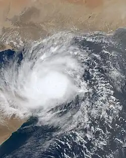 Early on May 30, the India Meteorological Department (IMD) and the Joint Typhoon Warning Center (JTWC) reported that an area of low pressure had formed about 925 km (575 mi), to the southwest of Mumbai, India. The area of low pressure had loose organized convection developing around the low level circulation center within the monsoon trough. The system was located to the south of a high pressure center anchored over Oman in an area of moderate vertical windshear. On May 31, the India Meteorological Department (IMD) upgraded an area of low pressure to a depression, giving it the designation "ARB 02".[12] The IMD further upgraded the depression into a deep depression the next day.[13] JTWC reported the same day that a Tropical Storm had formed.[14] On June 1, IMD upgraded the system into a cyclonic storm and named it "Phet".[15] The storm intensified to a Severe Cyclonic Storm in early hours of June 2.[16] The same day IMD upgraded the storm to a Very Severe Cyclonic Storm.[17] By the 5th, the cyclone had been downgraded to a cyclonic storm by the IMD as it passed over the Gulf of Oman.[18] On the 7th, Phet dissipated completely.[19]
