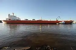 A perimeter was established around the affected area, and none of the oil had harmed local wildlife.[4] The collision occurred in a still part of the channel, which helped to limit the flow of oil both upstream or downstream. AET activated their OPA 90 response plan and called upon Resolve Marine to lighter and refloat the damaged vessel while contractors worked to contain the oil spilled.[6] While the section of the waterway the collision occurred in is largely industrial, there are marshes along shorelines in other parts that are susceptible to damage from oil spills.[7] The collision closed the Port Arthur waterway, and Coast Guard personnel could not immediately comment on how long it would take to clean the spill or reopen the channel. The only statement made regarding the time it would take to reopen the waterway was that "We're working as quickly as possible to clean up the spill," according to a Coast Guard officer.[3] By the day after the incident, about 1,100 barrels (170 m3) of spilled oil had been recovered, and most of the unrecovered oil was contained. However, according to both the Coast Guard and local officials, the possibility of currents in the channel picking up remained, and with it the potential for oil to flow downstream into marshes.[8] Four oil refineries operate in the Port Arthur area, with a total capacity of about 1.1 million barrels (170,000 m3) of oil a day. In statements, neither Exxon or Valero, which operate two of the refineries, said they expected operations to be disrupted by the collision. Neither Motiva Enterprises or Total, which operate the other two refineries, initially publicly responded to the spill.[4] In its response to the incident, the tanker's operator, AET Inc. said it was cooperating with investigators, and was prepared to bear the costs of cleanup, but noted that responsibility for the incident had not been determined. The company also refused to name the pilots in charge of the ship at the time of the collision.[8] On January 27, the tanker was removed from the waterway, and soon after, limited traffic through the channel was allowed to resume. In a statement on January 29, the Coast Guard said they hoped to allow full operations in the waterway to resume within a week.[9]