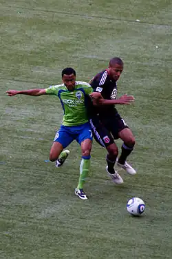 The Sounders FC began June with a 3–0 win against the New England Revolution at home, ending the scoreless pattern. Leo González scored in the fifth minute and started a 3-goal streak. Steve Zakuani volleyed in another goal in the 24th minute off of a kick by Brad Evans. The final goal of the match was scored by Fredy Montero in the 42nd minute, while the second half was more defensive.[36] During the final MLS match before the World Cup break, D.C. United defeated the team 3–2 in a nationally televised game. Chris Pontius scored all three of D.C.'s goals, two in the first half and one in the second. In the 90th minute, James Riley scored a goal and was accompanied by Montero's goal one minute later.[37]