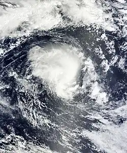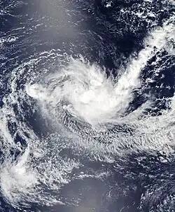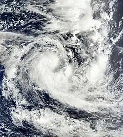 On March 6, an area of thunderstorms that TCWC Perth had been watching since March 3,[47] became a tropical low.[48] Later on the same day, the BoM designated the storm as Tropical Low 15U while the JTWC designated the storm as Tropical Cyclone 16S. On the morning of March 8, the low strengthened into a Category 1 tropical cyclone, assigning the name Koji.[49] However, a few hours later, Koji moved west of 90°E, and was renamed Joni by the Mauritius Meteorological Service. Over the next few days, Joni continued to organize. However, on March 11, wind shear began eroding away the storm's outer bands of convection. On March 12, strong wind shear completely eroded away the storm's northern convection, and displaced the remaining convection to the southeast of the storm, leaving Joni's low level circulation center completely exposed. As a result, Joni rapidly began to weaken. Late on March 12, RSMC Reunion issued their last advisory on Koji–Joni, as the storm degenerated into an extratropical low.