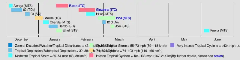 | Ethel | January 17–22 | Severe tropical storm | 100 km/h (60 mph) | 972 hPa (28.70 inHg) | Rodrigues | Unknown | 1 | [53] |