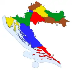 Since 1999 Croatia has been divided into 10 Croatian Parliament electoral districts, named using Roman numerals. These districts are roughly based on geography, but shaped according to the number of voters so that each district holds roughly the same number of registered voters, around 400,000.[22] These districts therefore do not correspond to the borders of top administrative divisions within Croatia and each district contains one or more or parts of several Croatian counties.