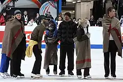 The temperatures at the Swiss venue were unusually cold for a skating event, reaching minus-3 Celsius.[1] ISU President Ottavio Cinquanta conceded it was something new to have the event in such conditions and said the ISU would be more vigilant in the future.[1] Many spectators used blankets to keep warm during the long hours of competition.[2] Skaters also admitted they were affected by the cold, and Russian Alexander Smirnov said that he felt like the muscles weren't ready and jokingly added "If we had known about the temperature earlier, we would have prepared for it at home in St. Petersburg by skating naked," adding that "it is a little strange that a competition of this level would be held under these conditions. But the conditions are the same for everyone."[3] German pair team Maylin Hausch and Daniel Wende aborted an Axel lasso lift on the take-off, with Wende later saying "Already after the first minute I felt like shock frozen; just before the first lift I had no feeling in my fingers and in my legs. I couldn't do anything to prevent it."[3] The practice rink also received some criticism, with Nóra Hoffmann saying, "It was so white and everybody got lost in it. That was specially my problem there, I was so lost in the rink that I couldn't really focus, I didn't know where I was going."[4]